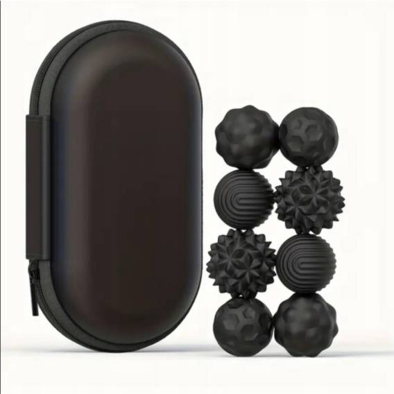Każda kulka ma unikalny kształt i fakturę – od delikatnych wypustek po spiralne rowki – dzięki czemu zapewnia różnorodne bodźce sensoryczne i kojące działanie 😌